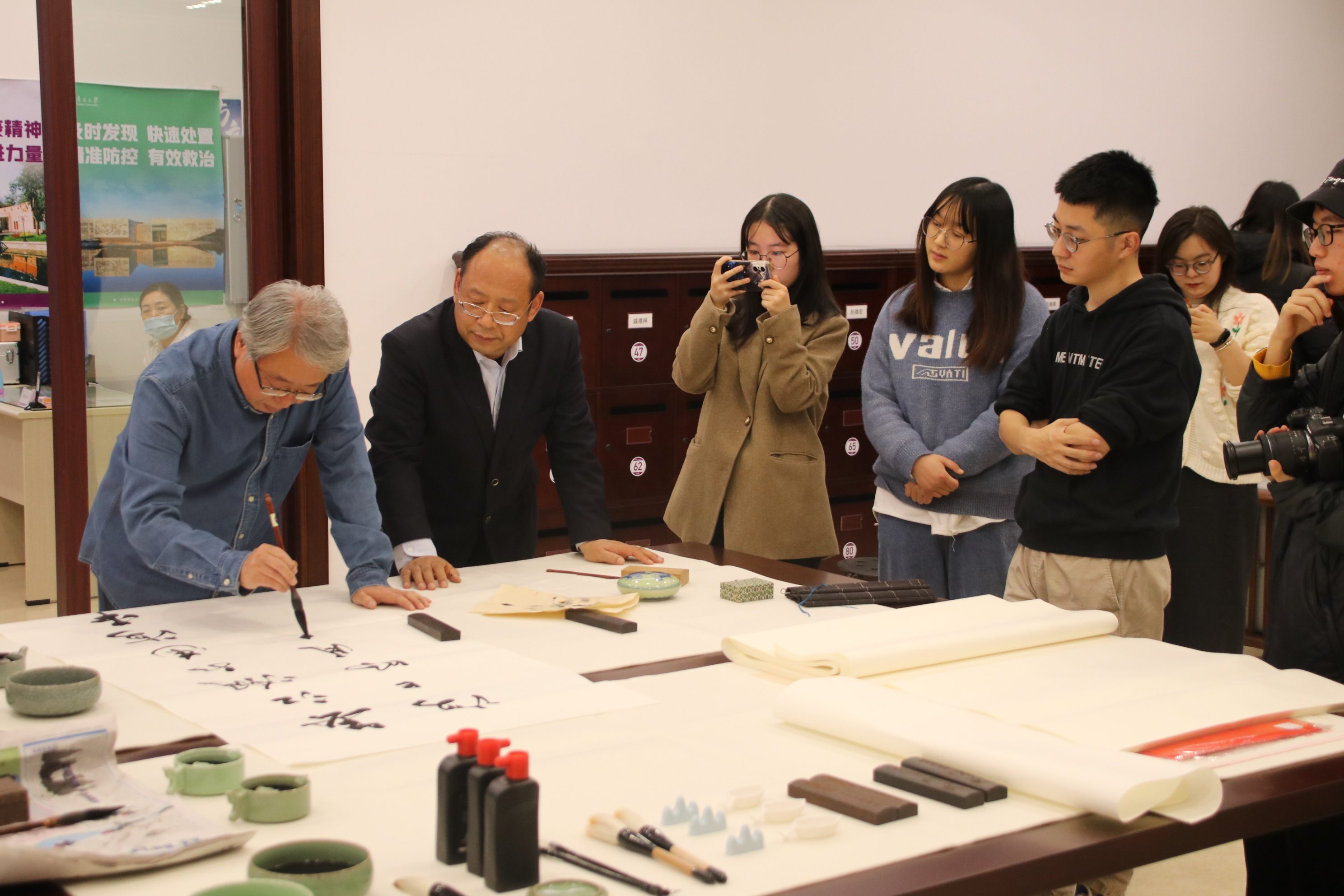 1123日,秀山堂一楼大厅,翰墨飘香,音乐流淌,三位教授在同学们的簇拥下挥毫泼墨,一幅幅书法作品跃然纸上,字体风格各异,笔力雄健,气韵生动。